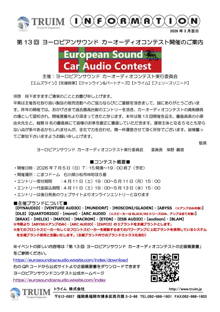 さて、本日は今年で第13回を数えます、弊社を含めたヨロッパブランドを輸入する5社共催のサウンドコンテストとなります「ヨーロピアンサウンドカーオーディオコンテスト」の開催概要を発表しましたので、軽くご案内します。