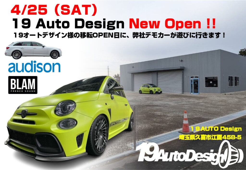 4月25日土曜日に移転オープンします、19オートデザイン様のオープン日に弊社デモカーが遊びに行きます!