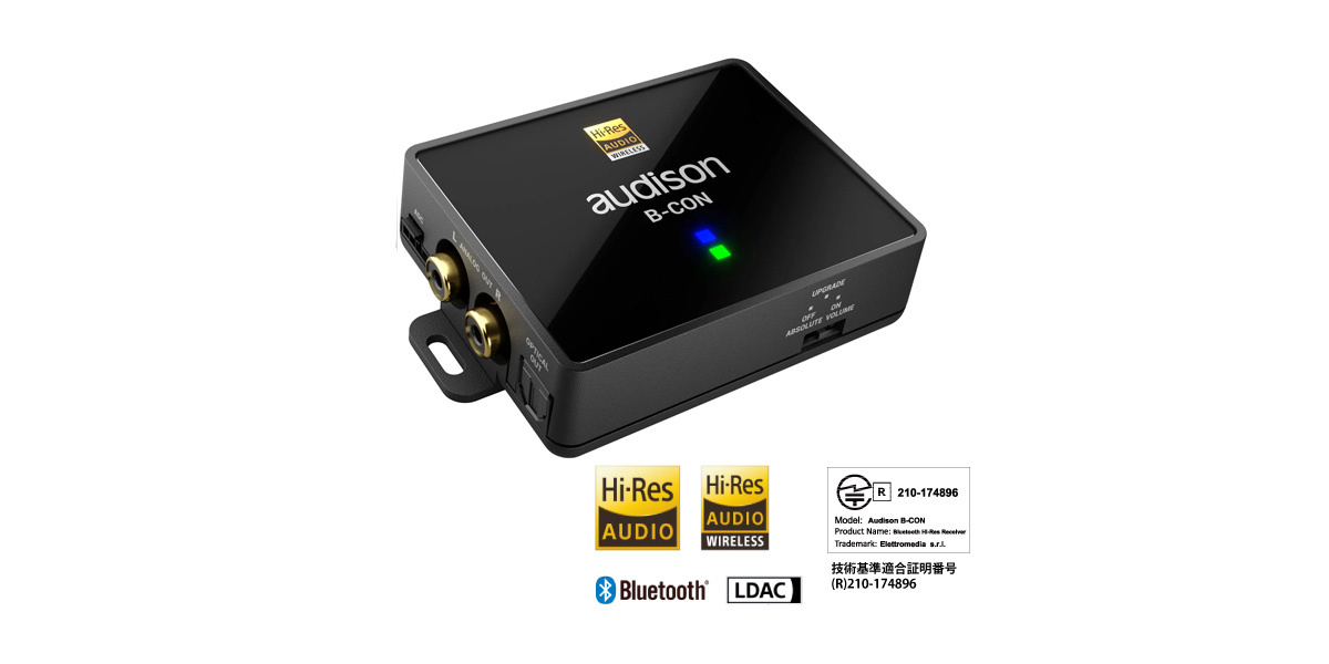 Audison B-CONはカーオーディオ用に設計されたBluetooth 5.0対応モジュールで、日本オーディオ協会の”ハイレゾオーディオワイヤレス”の認証を取得しており、ハイレゾ・プレーヤー(Fiio、Sony Walkman等)や最新のAndroid/iOSデバイスからストリーミング・オーディオを再生する際の理想的な選択肢のひとつとなります。